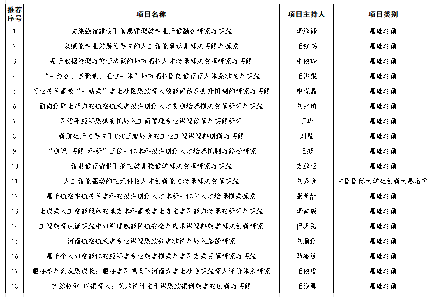 根据河南省教育厅《关于开展2026年河南省高等教育教学改革研究与实践项目立项工作的通知》(教高〔2026〕14 号)文件通知,我校组织开展了2026年河南省高等教育教学改革研究与实践项目评选推荐工作。经过个人申报、推荐单位初评、学校组织专家评审等环节,拟推荐18项参加省级教育教学改革研究与实践项目的遴选,现予以公示。